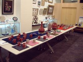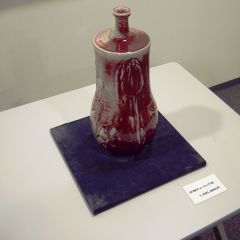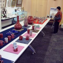 写真にも見られる、独特の紅釉(赤い釉薬)陶器は先生ならではの発色で海外を含め高く評価されており、今回は手軽に楽しめるマグカップや独特の製法で作られた「トジメカップ」、また壺や水指などの大作も展示されております。