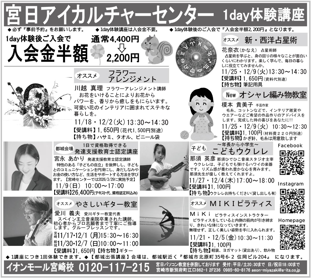 ☆GW期間中の営業時間の変更について☆ 新しいことを始めませんか?アイカルチャーセンターでは、講座の体験会を下記の日程で行っております。